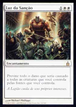 | Nome em Inglês: | Light of Sanction | | Nome em Português: | Luz da Sanção | | Custo de Mana: |    | | Tipo: | Encantamento | | Texto: | Previne todo o dano que seria causado às criaturas que você controla por fontes que você controla. | | Série: |  | | Raridade: | Raro | | Card: | 024 |