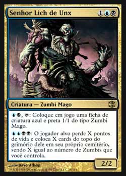 | Nome em Inglês: | Lich Lord of Unx | | Nome em Português: | Senhor Lich de Unx | | Custo de Mana: |    | | Tipo: | Criatura - Zumbi Mago | | Texto: |  , : Coloque no Campo de Batalha uma ficha de criatura azul e preta 1/1 do tipo Zumbi Mago