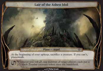 | Nome em Inglês: | Lair of the Ashen Idol | | Nome em Português: | Sem nome em Português | | Tipo: | Plano - Azgol | | Texto: | No início de sua Etapa de Manutenção, sacrifique uma criatura. Se você não puder, você deve Saltar para o próximo Plano. Toda vez que você obtiver no dado, cada um de qualquer número de jogadores alvo coloca no Campo de Batalha uma ficha de criatura preta 2/2 do tipo Zumbi. | | Série: |  | | Raridade: | NA | | Card: | 024 |