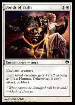 | Nome em Inglês: | Bonds of Faith | | Nome em Português: | Sem nome em Português | | Custo de Mana: |   | | Tipo: | Encantamento - Aura | | Texto: | Encantar criatura. A criatura encantada ganha +2/+2 enquanto for um Humano. Caso contrário, ela não pode atacar ou bloquear. | | Série: |  | | Outras: | | | Raridade: | Comum | | Card: | 024 |