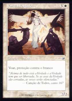 | Nome em Inglês: | Voice of Truth | | Nome em Português: | Voz da Verdade | | Custo de Mana: |   | | Tipo: | Criatura - Anjo | | Texto: | Voar, Proteção contra o branco. | | P/T: | 2/2 | | Série: |  | | Raridade: | Incomum | | Card: | 025 |