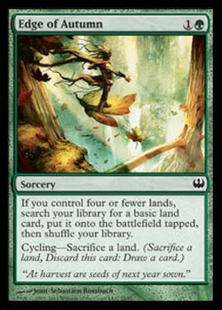 | Nome em Inglês: | Edge of Autumn | | Nome em Português: | Sem nome em Português | | Custo de Mana: |   | | Tipo: | Feitiço | | Texto: | Se você controlar quatro ou menos terrenos, procure em seu grimório por um card de terreno básico e coloque-o no Campo de Batalha virado. Embaralhe seu grimório a seguir. Reciclar - Sacrifique um terreno. | | Série: |  | | Outras: | | | Raridade: | Comum | | Card: | 025 |