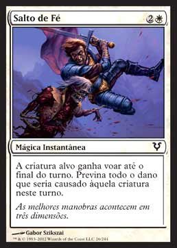 | Nome em Inglês: | Leap of Faith | | Nome em Português: | Salto de Fé | | Custo de Mana: |   | | Tipo: | Mágica Instantânea | | Texto: | A criatura alvo tem Voar até o final do turno. Previne todo o dano que seria causado àquela criatura durante este turno. | | Série: |  | | Raridade: | Comum | | Card: | 026 |