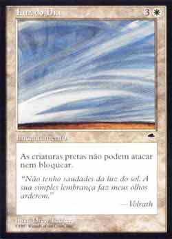 | Nome em Inglês: | Light of Day | | Nome em Português: | Luz do Dia | | Custo de Mana: |   | | Tipo: | Encantamento | | Texto: | As criaturas pretas não podem atacar ou bloquear. | | Série: |  | | Outras: | | | Raridade: | Incomum | | Card: | 027 |