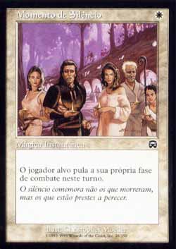 | Nome em Inglês: | Moment of Silence | | Nome em Português: | Momento de Silêncio | | Custo de Mana: |  | | Tipo: | Mágica Instantânea | | Texto: | O jogador alvo pula sua próxima Fase de Combate durante este turno. | | Série: |  | | Raridade: | Comum | | Card: | 028 |
