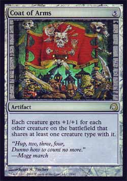 | Nome em Inglês: | Coat of Arms | | Nome em Português: | Sem nome em Português | | Custo de Mana: |  | | Tipo: | Artefato | | Texto: | Cada criatura ganha +1/+1 para cada outra criatura no Campo de Batalha que compartilhe um tipo de criatura com aquela criatura. | | Série: |  | | Outras: | | | Raridade: | Raro | | Card: | 029 |