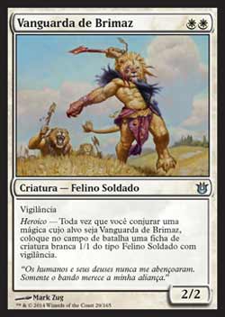 | Nome em Inglês: | Vanguard of Brimaz | | Nome em Português: | Vanguarda de Brimaz | | Custo de Mana: |   | | Tipo: | Criatura - Felino Soldado | | Texto: | Vigilância. Heroico - Toda vez que que você Conjurar uma mágica cujo alvo seja Vanguard of Brimaz, coloque no Campo de Batalha uma ficha de criatura branca 1/1 do tipo Felino Soldado com Vigilância. | | P/T: | 2/2 | | Série: |  | | Raridade: | Incomum | | Card: | 029 |
