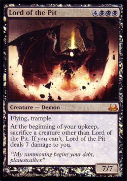 | Nome em Inglês: | Lord of the Pit | | Nome em Português: | Sem nome em Português | | Custo de Mana: |     | | Tipo: | Criatura - Demônio | | Texto: | Voar, Atropelar. No início de sua Etapa de Manutenção, sacrifique uma criatura que não seja Lord of the Pit. Se não o fizer, vire Lord of the Pit, e Lord of the Pit causa 7 pontos de dano a você. | | P/T: | 7/7 | | Série: |  | | Outras: | | | Raridade: | Mítico Raro | | Card: | 030 |