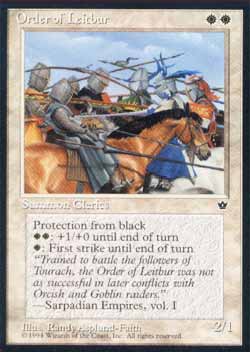 | Nome em Inglês: | Order of Leitbur | | Nome em Português: | Sem nome em Português | | Custo de Mana: |   | | Tipo: | Criatura - Humano Clérigo Cavaleiro | | Texto: | Proteção contra o preto.