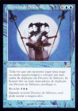 | Nome em Inglês: | Decree of Silence | | Nome em Português: | Decreto de Silêncio | | Custo de Mana: |    | | Tipo: | Encantamento | | Texto: | Toda vez que um oponente Conjurar uma mágica, anula aquela mágica e coloque um marcador de depleção em Decree of Silence. Se houver três ou mais marcadores de depleção em Decree of Silence, sacrifique-o. Reciclar   . Quando você Reciclar Decree of Silence, você pode anular a mágica alvo. | | Série: |  | | Raridade: | Raro | | Card: | 032 |