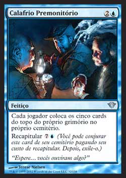 | Nome em Inglês: | Chill of Foreboding | | Nome em Português: | Calafrio Premonitório | | Custo de Mana: |   | | Tipo: | Feitiço | | Texto: | Cada jogador coloca os cinco cards do topo de seu próprio grimório em seu próprio cemitério. Recapitular  . | | Série: |  | | Raridade: | Incomum | | Card: | 032 |