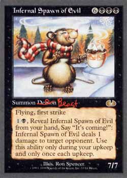 , revele Infernal Spawn of Evil de sua mão, diga 'Ele está vindo!': Infernal Spawn of Evil causa 1 ponto de dano ao oponente alvo. Ative esta habilidade apenas durante sua Etapa de Manutenção e apenas uma vez a cada Etapa de Manutenção. | | P/T: | 7/7 | | Série: |  | | Raridade: | Raro | | Card: | 033 |