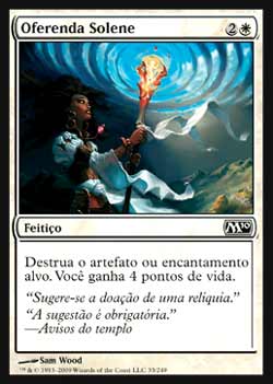 | Nome em Inglês: | Solemn Offering | | Nome em Português: | Oferenda Solene | | Custo de Mana: |   | | Tipo: | Feitiço | | Texto: | Destrói o artefato alvo ou encantamento alvo. Você ganha 4 pontos de vida. | | Série: |  | | Outras: | | | Raridade: | Comum | | Card: | 033 |