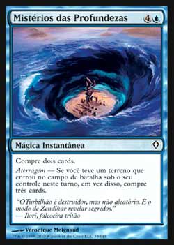 | Nome em Inglês: | Mysteries of the Deep | | Nome em Português: | Mistérios das Profundezas | | Custo de Mana: |   | | Tipo: | Mágica Instantânea | | Texto: | Compre dois cards. Aterragem - Se um terreno tiver entrado no Campo de Batalha sob seu controle durante este turno, compre três cards ao invés. | | Série: |  | | Raridade: | Comum | | Card: | 033 |