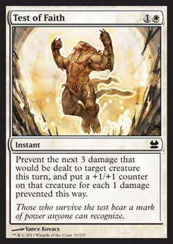 | Nome em Inglês: | Test of Faith | | Nome em Português: | Sem nome em Português | | Custo de Mana: |   | | Tipo: | Mágica Instantânea | | Texto: | Previne os próximos 3 pontos de dano que seriam causados à criatura alvo durante este turno, e coloque um marcador +1/+1 naquela criatura para cada 1 ponto de dano prevenido desta forma. | | Série: |  | | Outras: | | | Raridade: | Comum | | Card: | 033 |