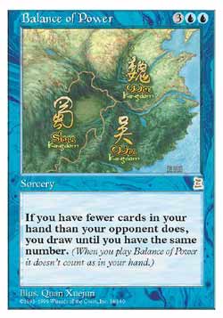 | Nome em Inglês: | Balance of Power | | Nome em Português: | Sem nome em Português | | Custo de Mana: |    | | Tipo: | Feitiço | | Texto: | se você tiver menos cards em sua mão do que o oponente alvo, você compra até você ter o mesmo número de cards que aquele oponente. | | Série: |  | | Outras: | | | Raridade: | Raro | | Card: | 034 |