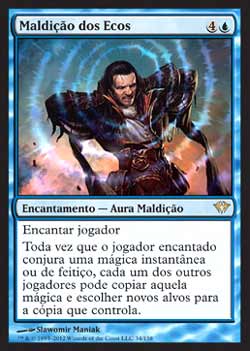 | Nome em Inglês: | Curse of Echoes | | Nome em Português: | Maldição dos Ecos | | Custo de Mana: |   | | Tipo: | Encantamento - Aura Maldição | | Texto: | Encantar jogador. Toda vez que o jogador encantado Conjurar uma Mágica Instantânea ou feitiço, cada outro jogador pode copiar aquela mágica e escolher novos alvos para a cópia que ele próprio controla. | | Série: |  | | Raridade: | Raro | | Card: | 034 |