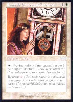 | Nome em Inglês: | Rune of Protection: Artifacts | | Nome em Português: | Runa de Proteção: Artefatos | | Custo de Mana: |   | | Tipo: | Encantamento | | Texto: | : Na próxima vez que uma fonte a sua escolha que seja um artefato fosse causar dano a você durante este turno, previne aquele dano. Reciclar . | | Série: |  | | Raridade: | Incomum | | Card: | 035 |
