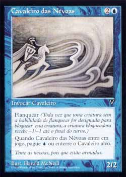 | Nome em Inglês: | Knight of the Mists | | Nome em Português: | Cavaleiro das Névoas | | Custo de Mana: |   | | Tipo: | Criatura - Humano Cavaleiro | | Texto: | Flanquear. Quando Knight of the Mists entrar no Campo de Batalha, você pode pagar . Se não o fizer, destrói o Cavaleiro alvo. Aquela criatura não pode ser Regenerada. | | P/T: | 2/2 | | Série: |  | | Raridade: | Comum | | Card: | 036 |