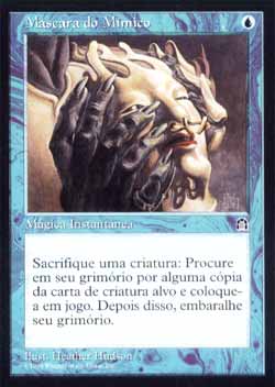 | Nome em Inglês: | Mask of the Mimic | | Nome em Português: | Máscara do Mímico | | Custo de Mana: |  | | Tipo: | Mágica Instantânea | | Texto: | Como um custo adicional para Conjurar Mask of the Mimic, sacrifique uma criatura. Procure em seu grimório por um card com o mesmo nome que um card de criatura alvo no Campo de Batalha. Coloque aquele card no Campo de Batalha. Embaralhe seu grimório a seguir. | | Série: |  | | Raridade: | Incomum | | Card: | 037 |