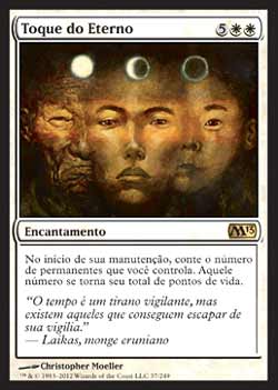| Nome em Inglês: | Touch of the Eternal | | Nome em Português: | Toque do Eterno | | Custo de Mana: |    | | Tipo: | Encantamento | | Texto: | No início de sua Etapa de Manutenção, conte o número de Permanentes que você controla. Seu total de pontos de vida se torna aquele número. | | Série: |  | | Raridade: | Raro | | Card: | 037 |