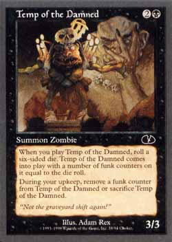 | Nome em Inglês: | Temp of the Damned | | Nome em Português: | Sem nome em Português | | Custo de Mana: |   | | Tipo: | Criatura - Zumbi | | Texto: | Quando você Conjurar Temp of the Damned, jogue um dado de seis lados. Temp of the Damned entra no Campo de Batalha com um número de marcadores de funk igual ao resultado obtido no dado. Durante sua Etapa de Manutenção, remova um marcador de funk de Temp of the Damned ou sacrifique Temp of the Damned. | | P/T: | 3/3 | | Série: |  | | Raridade: | Comum | | Card: | 038 |