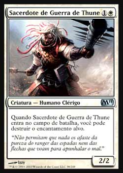 | Nome em Inglês: | War Priest of Thune | | Nome em Português: | Sacerdote de Guerra de Thune | | Custo de Mana: |   | | Tipo: | Criatura - Humano Clérigo | | Texto: | Quando War Priest of Thune entrar no Campo de Batalha, você pode destruir o encantamento alvo. | | P/T: | 2/2 | | Série: |  | | Outras: | | | Raridade: | Incomum | | Card: | 038 |
