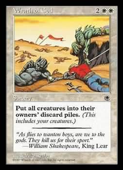 | Nome em Inglês: | Wrath of God | | Nome em Português: | Sem nome em Português | | Custo de Mana: |    | | Tipo: | Feitiço | | Texto: | Destrói todas as criaturas. Elas não podem ser Regeneradas. | | Série: |  | | Outras: | | | Raridade: | Raro | | Card: | 039 |