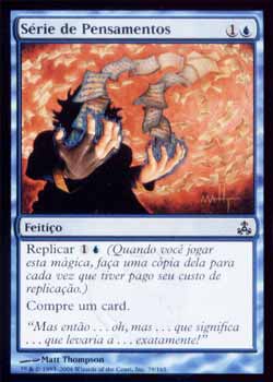 | Nome em Inglês: | Train of Thought | | Nome em Português: | Serie de Pensamentos | | Custo de Mana: |   | | Tipo: | Feitiço | | Texto: | Replicar  . Compre um card. | | Série: |  | | Outras: | | | Raridade: | Comum | | Card: | 039 |