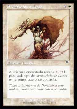 | Nome em Inglês: | Strength of Unity | | Nome em Português: | A União faz a Força | | Custo de Mana: |   | | Tipo: | Encantamento - Aura | | Texto: | Encantar criatura. Dominar - A criatura encantada ganha +1/+1 para cada tipo de terreno básico entre os terrenos que você controla. | | Série: |  | | Raridade: | Comum | | Card: | 040 |