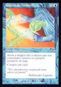 | Nome em Inglês: | Grip of Amnesia | | Nome em Português: | Garras da Amnésia | | Custo de Mana: |   | | Tipo: | Mágica Instantânea | | Texto: | Anula a mágica alvo a menos que seu controlador Exile o seu cemitério. Compre um card. | | Série: |  | | Raridade: | Comum | | Card: | 041 |
