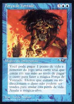 | Nome em Inglês: | Force of Will | | Nome em Português: | Força de Vontade | | Custo de Mana: |    | | Tipo: | Mágica Instantânea | | Texto: | Você pode pagar 1 ponto de vida e Exilar um card azul de sua mão ao invés de pagar o custo de mana de Force of Will. Anula a mágica alvo. | | Série: |  | | Raridade: | Incomum | | Card: | 042 |