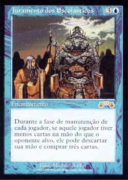 | Nome em Inglês: | Oath of Scholars | | Nome em Português: | Juramento dos Escolásticos | | Custo de Mana: |   | | Tipo: | Encantamento | | Texto: | No início da Etapa de Manutenção de cada jogador, se aquele jogador tiver menos cards em sua mão do que qualquer um de seus próprios oponentes, aquele jogador pode descartar sua própria mão e comprar três cards. | | Série: |  | | Raridade: | Raro | | Card: | 042 |