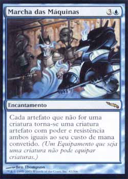 | Nome em Inglês: | March of the Machines | | Nome em Português: | Marcha das Máquinas | | Custo de Mana: |   | | Tipo: | Encantamento | | Texto: | Cada artefato que não seja uma criatura é uma criatura artefato com poder e resistência ambos iguais ao seu Custo de Mana Convertido (um Equipamento que seja uma criatura não pode Equipar uma criatura.) | | Série: |  | | Outras: | | | Raridade: | Raro | | Card: | 042 |