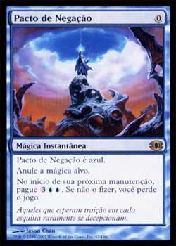 | Nome em Inglês: | Pact of Negation | | Nome em Português: | Pacto de Negação | | Custo de Mana: |  | | Tipo: | Mágica Instantânea | | Texto: | Pact of Negation é azul. Anula a mágica alvo. No início de sua próxima Etapa de Manutenção, pague   . Se não o fizer, você perde o jogo. | | Série: |  | | Outras: | | | Raridade: | Raro | | Card: | 042 |