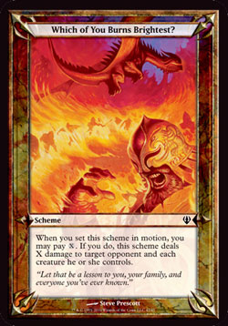 | Nome em Inglês: | Which of You Burns Brightest? | | Nome em Português: | Sem nome em Português | | Tipo: | Esquema | | Texto: | Quando você colocar este Esquema para funcionar, você pode pagar . Se o fizer, este Esquema causa X pontos de dano ao oponente alvo e a cada criatura que ele controla. | | Série: |  | | Raridade: | NA | | Card: | 042 |