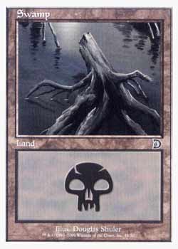 | Nome em Inglęs: | Swamp | | Nome em Portuguęs: | Sem nome em Portuguęs | | Tipo: | Terreno Básico - Pântano | | Texto: | : Adiciona a sua reserva de mana. | | Série: |  | | Outras: | | | Raridade: | Terreno Básico | | Card: | 044 |