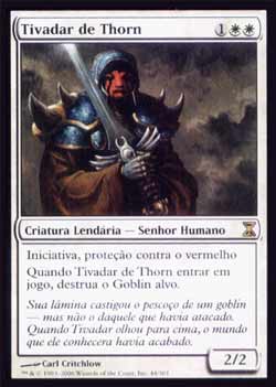 | Nome em Inglês: | Tivadar of Thorn | | Nome em Português: | Tivadar de Thorn | | Custo de Mana: |    | | Tipo: | Criatura Lendária - Humano Cavaleiro | | Texto: | Iniciativa, Proteção contra o vermelho. Quando Tivadar of Thorn entrar no Campo de Batalha, destrói o Goblin alvo. | | P/T: | 2/2 | | Série: |  | | Raridade: | Raro | | Card: | 044 |