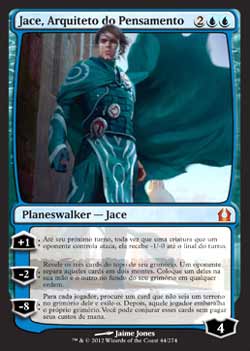 | Nome em Inglês: | Jace, Architect of Thought | | Nome em Português: | Jace, Arquiteto do Pensamento | | Custo de Mana: |    | | Tipo: | Planeswalker - Jace | | Texto: | +1: Até o seu próximo turno, toda vez que uma criatura que um oponente controla atacar, ela ganha -1/-0 até o final do turno. -2: Revele os três cards do topo de seu grimório. Um oponente separa aqueles cards em duas pilhas. Coloque os cards de uma pilha em sua mão e o restante no fundo de seu grimório em qualquer ordem. -8: Para cada jogador, procure no grimório daquele jogador por um card que não seja de terreno e Exile-o, então aquele jogador embaralha seu próprio grimório. Você pode Conjurar aqueles cards sem pagar seus custos de mana. | | P/T: | 4 | | Série: |  | | Raridade: | Mítico Raro | | Card: | 044 |