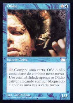 | Nome em Inglês: | Ophidian | | Nome em Português: | Ofídio | | Custo de Mana: |   | | Tipo: | Criatura - Cobra | | Texto: | Toda vez que Ophidian atacar e não for bloqueado, você pode comprar um card. Se o fizer, Ophidian não causa dano de combate durante este turno. | | P/T: | 1/3 | | Série: |  | | Outras: | | | Raridade: | Comum | | Card: | 045 |