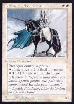 | Nome em Inglês: | Order of the White Shield | | Nome em Português: | Ordem do Escudo Branco | | Custo de Mana: |   | | Tipo: | Criatura - Humano Cavaleiro | | Texto: | Proteção contra o preto.
