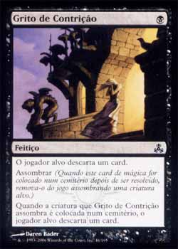 | Nome em Inglês: | Cry of Contrition | | Nome em Português: | Grito de Contrição | | Custo de Mana: |  | | Tipo: | Feitiço | | Texto: | O jogador alvo descarta um card. Assombrar. Quando a criatura que Cry of Contrition Assombra Morrer, o jogador alvo descarta um card. | | Série: |  | | Raridade: | Comum | | Card: | 046 |