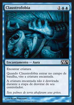 | Nome em Inglês: | Claustrophobia | | Nome em Português: | Claustrofobia | | Custo de Mana: |    | | Tipo: | Encantamento - Aura | | Texto: | Encantar criatura. Quando Claustrophobia entrar no Campo de Batalha, vire a criatura encantada. A criatura encantada não desvira durante a Etapa de Desvirar de seu controlador. | | Série: |  | | Outras: | | | Raridade: | Comum | | Card: | 046 |