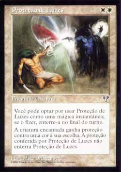 | Nome em Inglês: | Ward of Lights | | Nome em Português: | Proteção de Luzes | | Custo de Mana: |   | | Tipo: | Encantamento - Aura | | Texto: | Você pode Conjurar este card como se ele tivesse Lampejo. Se este card foi Conjurado a qualquer momento em que um feitiço não pudesse ter sido Conjurado, o controlador da permanente que ele se tornou a sacrifica no início da próxima Etapa de Limpeza. Encantar criatura. Conforme Ward of Lights entra no Campo de Batalha, escolha uma cor. A criatura encantada tem Proteção contra a cor escolhida. | | Série: |  | | Raridade: | Comum | | Card: | 047 |
