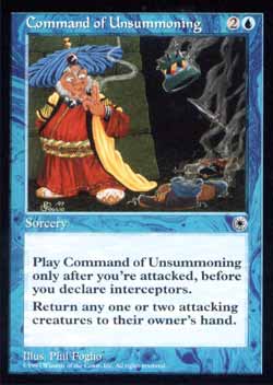 | Nome em Inglês: | Command of Unsummoning | | Nome em Português: | Sem nome em Português | | Custo de Mana: |   | | Tipo: | Mágica Instantânea | | Texto: | Conjure Command of Unsummoning apenas no turno de um oponente. Devolva uma ou duas criaturas atacantes alvo para as mãos de seus donos. | | Série: |  | | Raridade: | Incomum | | Card: | 048 |