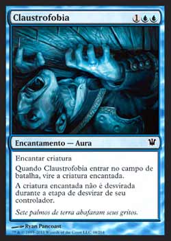 | Nome em Inglês: | Claustrophobia | | Nome em Português: | Claustrofobia | | Custo de Mana: |    | | Tipo: | Encantamento - Aura | | Texto: | Encantar criatura. Quando Claustrophobia entrar no Campo de Batalha, vire a criatura encantada. A criatura encantada não desvira durante a Etapa de Desvirar de seu controlador. | | Série: |  | | Outras: | | | Raridade: | Comum | | Card: | 048 |