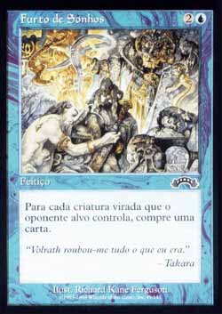 | Nome em Inglês: | Theft of Dreams | | Nome em Português: | Furto de Sonhos | | Custo de Mana: |   | | Tipo: | Feitiço | | Texto: | Para cada criatura virada que o oponente alvo controla, compre um card. | | Série: |  | | Outras: | | | Raridade: | Comum | | Card: | 049 |