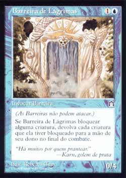 | Nome em Inglês: | Wall of Tears | | Nome em Português: | Barreira de Lágrimas | | Custo de Mana: |   | | Tipo: | Criatura - Barreira | | Texto: | Defensor. Toda vez que Wall of Tears bloquear uma criatura, devolva aquela criatura para a mão de seu dono no final do combate. | | P/T: | 0/4 | | Série: |  | | Raridade: | Incomum | | Card: | 050 |