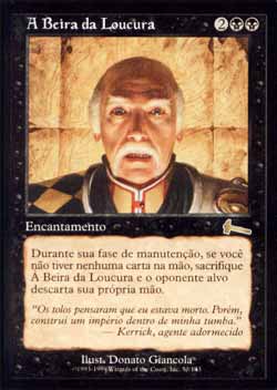 | Nome em Inglês: | Brink of Madness | | Nome em Português: | À Beira da Loucura | | Custo de Mana: |    | | Tipo: | Encantamento | | Texto: | No início de sua Etapa de Manutenção, se você não tem nenhum card em sua mão, sacrifique Brink of Madness. Se o fizer, o oponente alvo descarta sua própria mão. | | Série: |  | | Raridade: | Raro | | Card: | 050 |