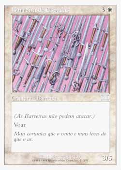 | Nome em Inglês: | Wall of Swords | | Nome em Português: | Barreira de Espadas | | Custo de Mana: |   | | Tipo: | Criatura - Barreira | | Texto: | Defensor, Voar. | | P/T: | 3/5 | | Série: |  | | Outras: | | | Raridade: | Incomum | | Card: | 051 |